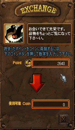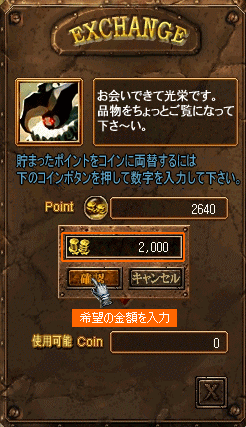| 2.まずExchange ボタンをクリックして、決済ページから移したポイントをゲーム内で使用可能なコインに両替します。 |