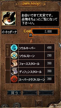 | 3.Exchange ウィンドウを閉じた後、またイ=トゥダ=ナ NPCをクリックしてItem Shop ボタンをクリックします。 |