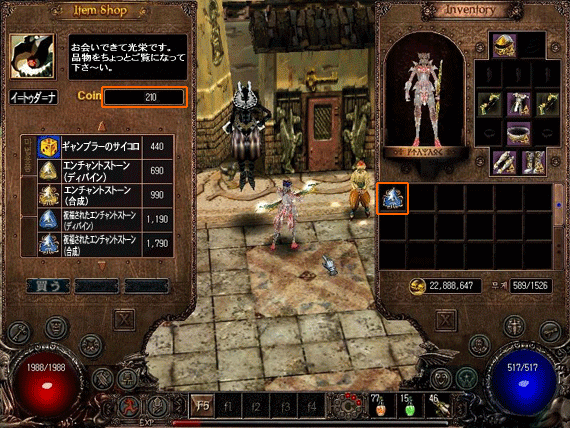 | 5.購入が完了すれば下の絵と同じようにアイテムがインベントリに入り、コインは減ります。 |